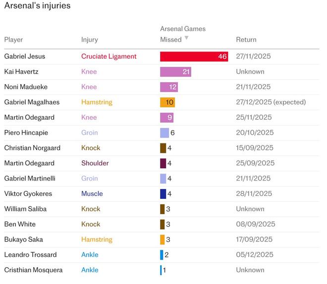 英超15輪后,阿森納一線隊的25名球員里,有17人本賽季因傷或因病缺席過至少一場比賽。且傷病集中在同一位置(如4名中衛(wèi)、3名前鋒缺陣),《每日電訊報》指出,阿森納的傷病源于替補球員負荷激增、賽程密集導(dǎo)致訓練不足、戰(zhàn)術(shù)對爆發(fā)力的依賴等,也存在比賽意外因素。